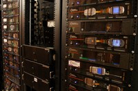 というのをリモートアクセスで企業ユーザーに提供する、というのが事業。百聞は一見にしかず、で、この写真を見てください。サーバ状の箱の中に、携帯電話が格納されています。