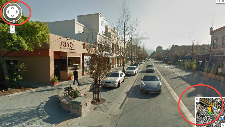 グーグルのストリートビューも、よく見ると方角と小さな地図がついてますよね。下記の赤丸のところ。