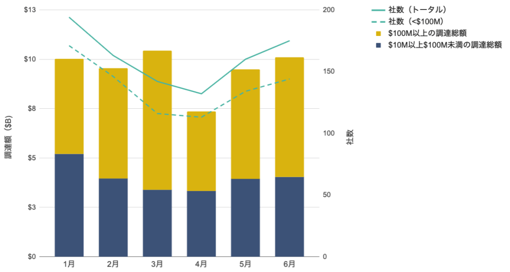 下のグラフは、1000万ドル以上増資したアメリカのベンチャーについて増資総額(棒)と社数(折れ線)を今年の1月から6月まで月ごとに表示したもの。黄色はその中でも1億ドル以上の調達の総額(とても多い)。緑は、実線がトータルの社数、破線が1億ドル未満の増資をした社数である(要はちょっとの社数で莫大に調達している、ということ)。