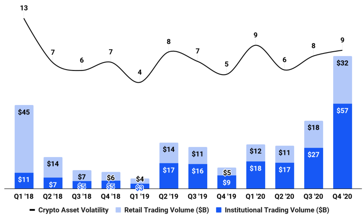 2020年は機関投資家がインフレのヘッジとしてビットコインに投資する傾向が強まった。第四四半期の取引高の60%以上が機関投資家によるもの。